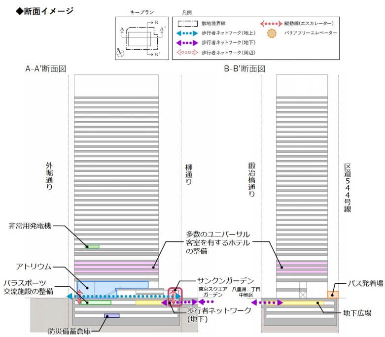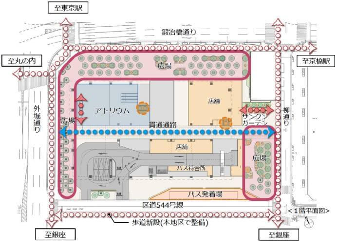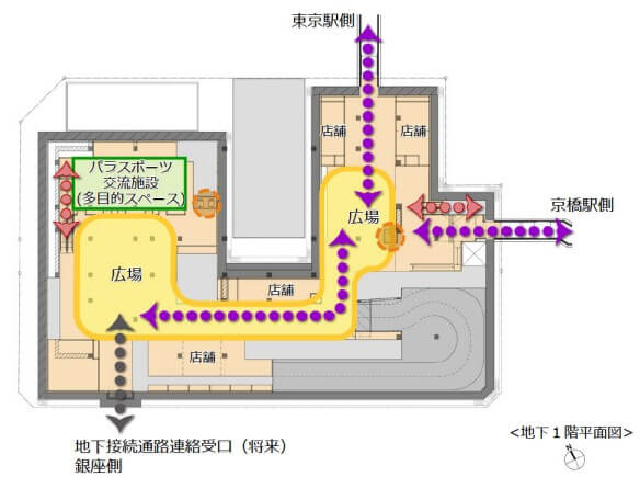 以下、地下一階の平面図です。東京駅側とは「八重洲二丁目中地区第一種市街地再開発事業」と地下で繋がる予定です。また京橋側では、「東京スクエアガーデン」側と繋がる予定です。「東京スクエアガーデン」側に、地下で繋がる空間があるかどうかは、そのうち確認しようと思っています。