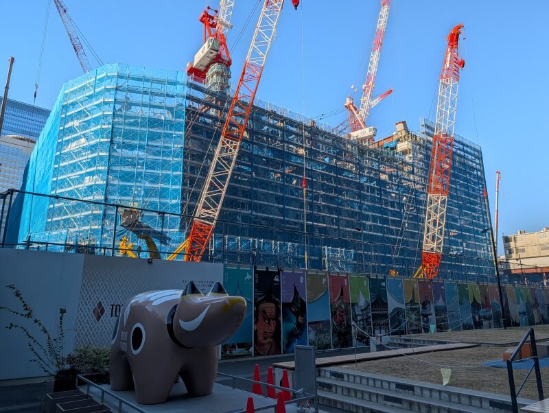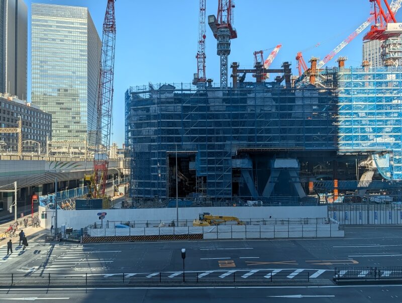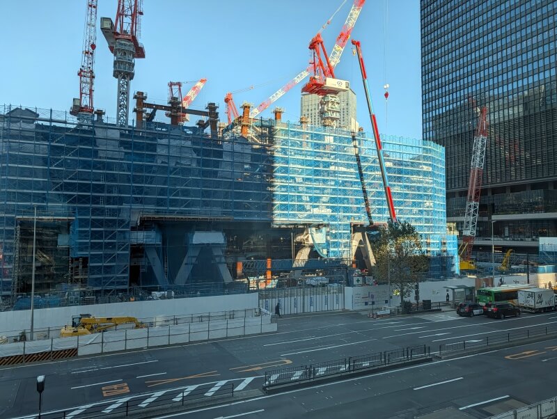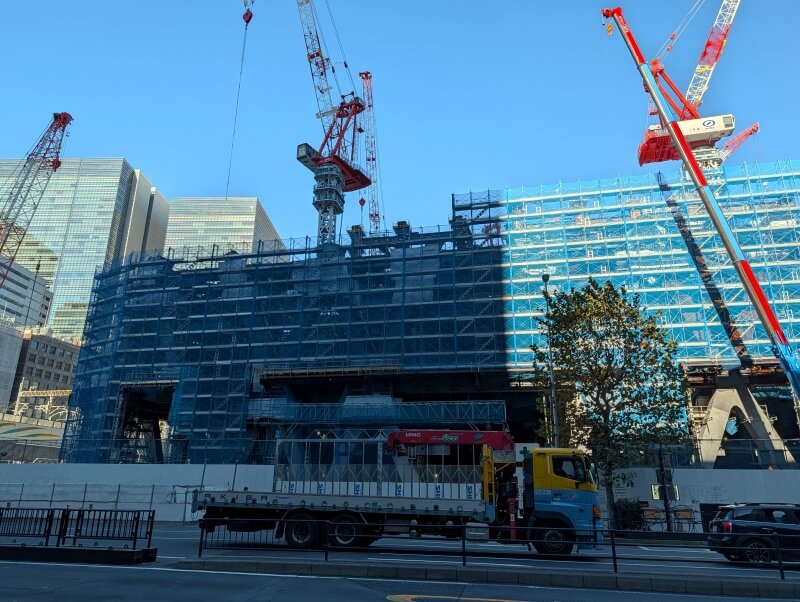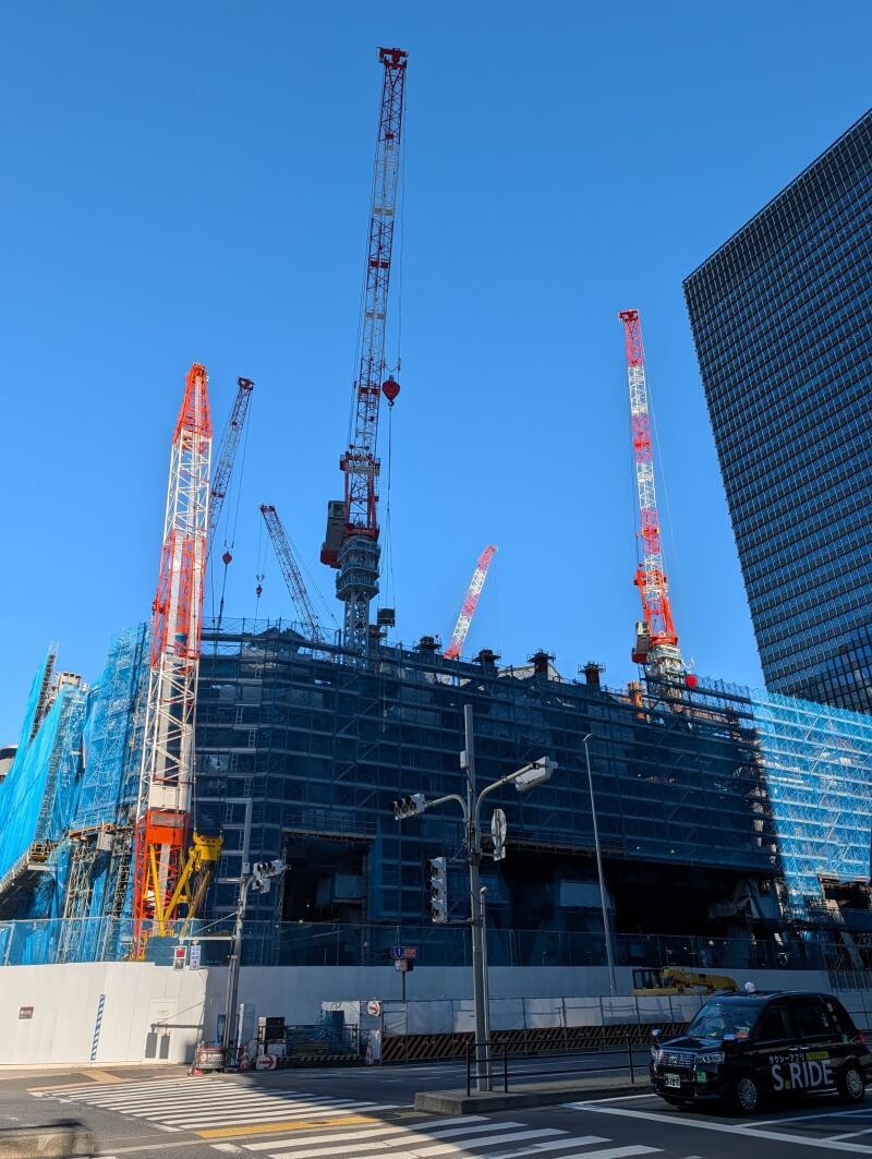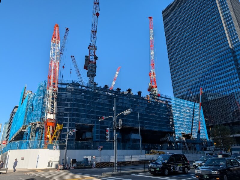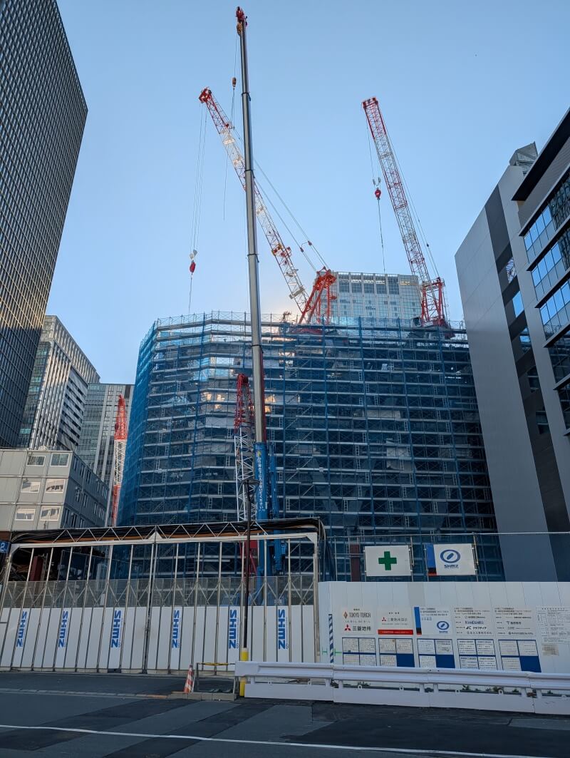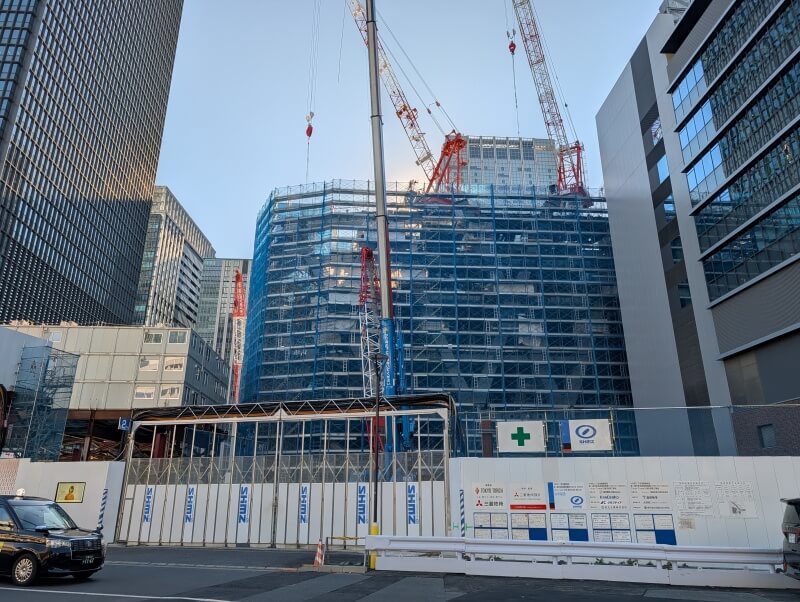 永代通りを渡り、「常盤橋タワー」と「トーチタワー」の間の、巨大赤べこちゃんと一緒に施行中の建物を見た様子です。