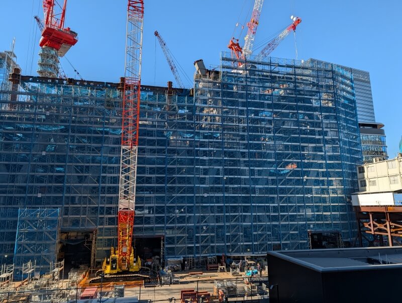 施行中の建物の北東側を見た様子です。高さ385mの建物を支える、「ダイヤグリッド架構」の斜め鉄骨柱が段々と見えてきていました。