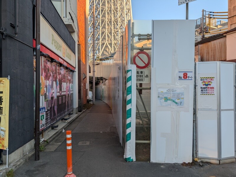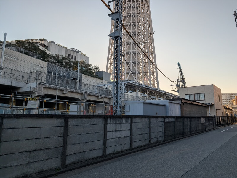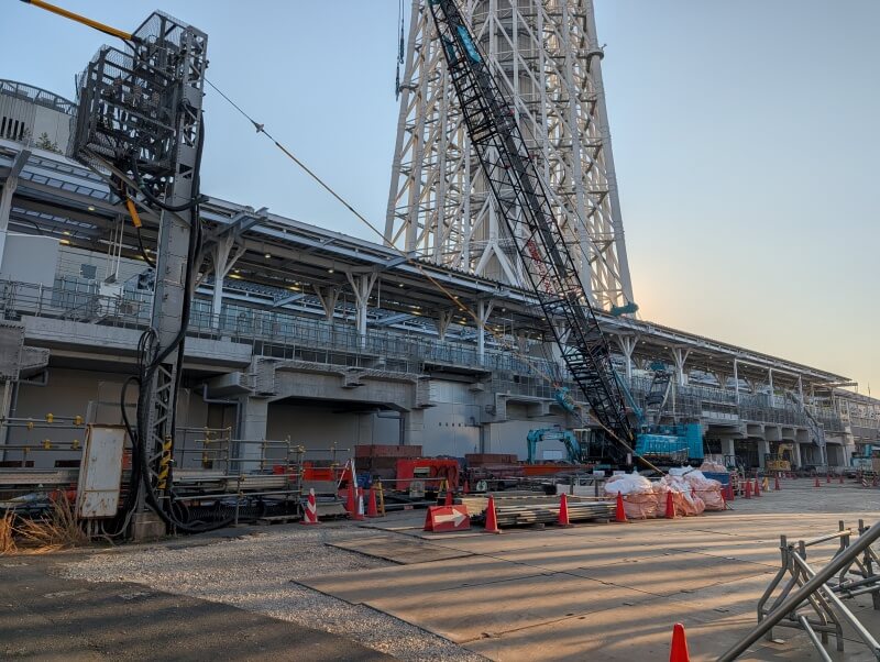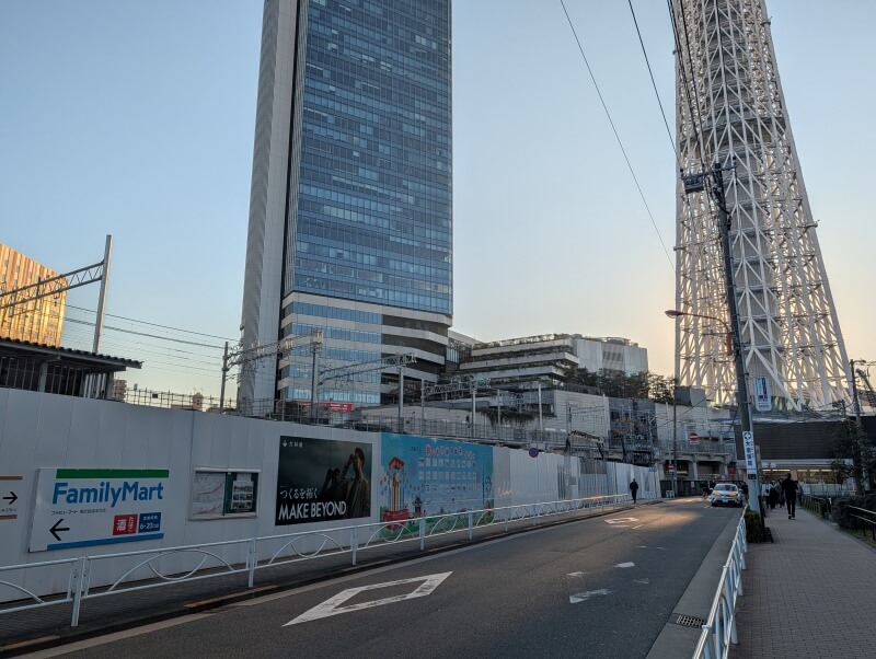 とうきょうスカイツリー駅北交差点から、「とうきょうスカイツリー駅」駅舎方向を見た様子です。工事用車両の出入口が急な傾斜になっており、工事関係車両の出入りが大変だったのだろうなと思いました。