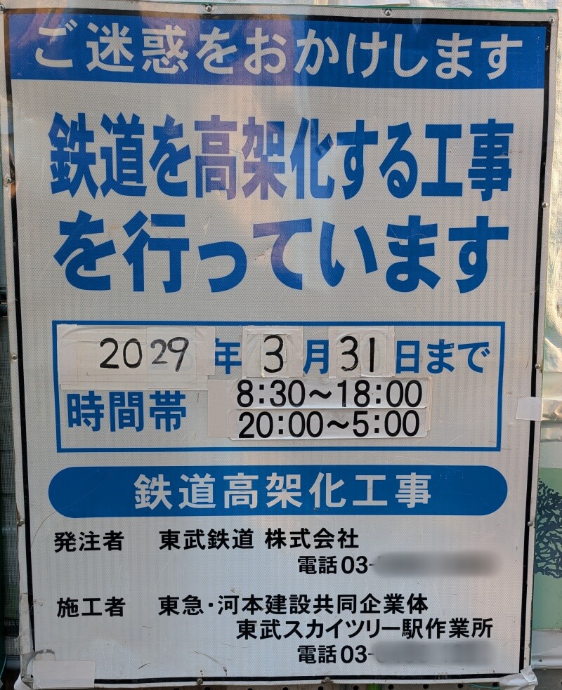 現地に掲示されていた、鉄道高架化の工事のお知らせです。鉄道高架化工事は、2029年3月31日迄となっていました。