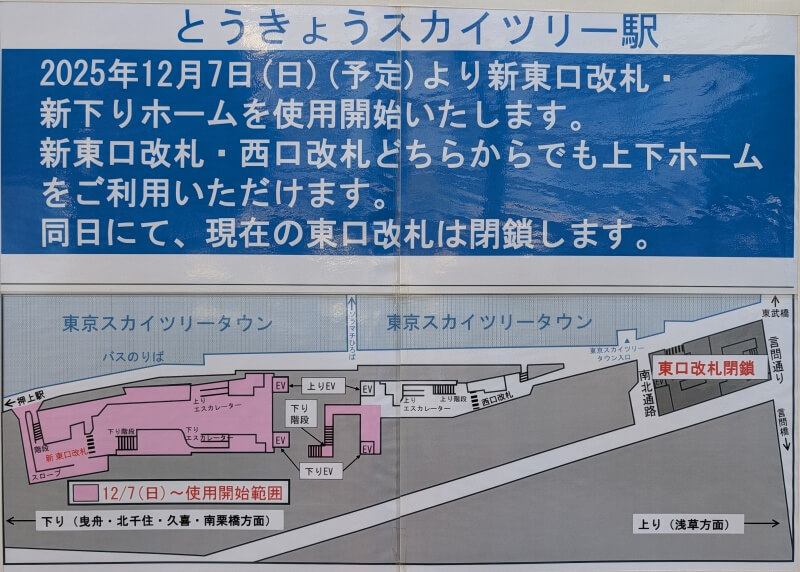 「とうきょうスカイツリー駅」の改札に向かう途中の壁に掲示されていた、新駅舎および新下りホーム使用開始のお知らせです。