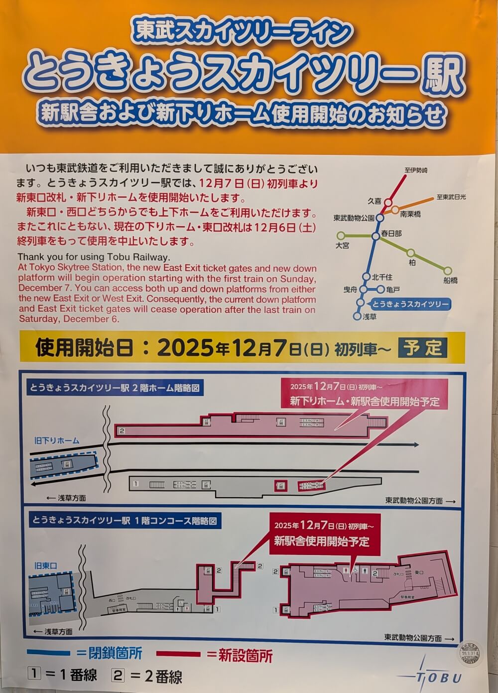 2025年12月7日に、「とうきょうスカイツリー駅」の下り線、新ホームが使用開始となりました。今までは、上りホームだけ新駅舎のホームが使われており、下り線は旧駅舎のホームが使用されていて、改札も分かれていました。