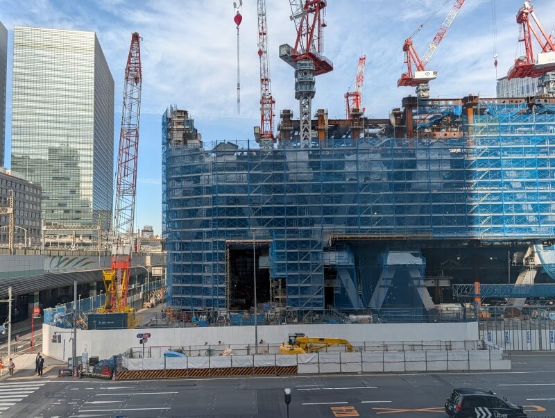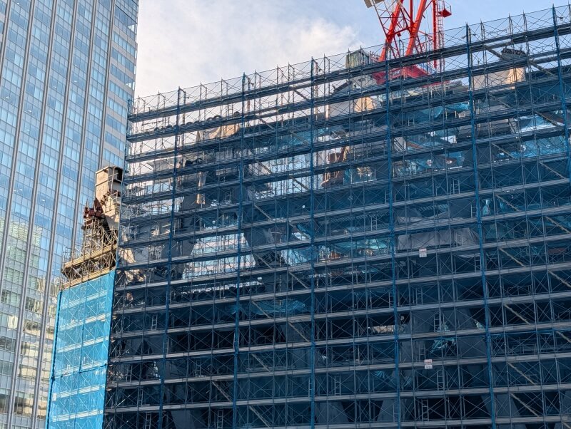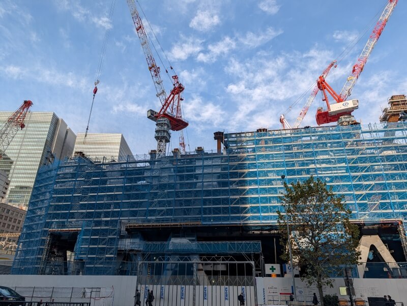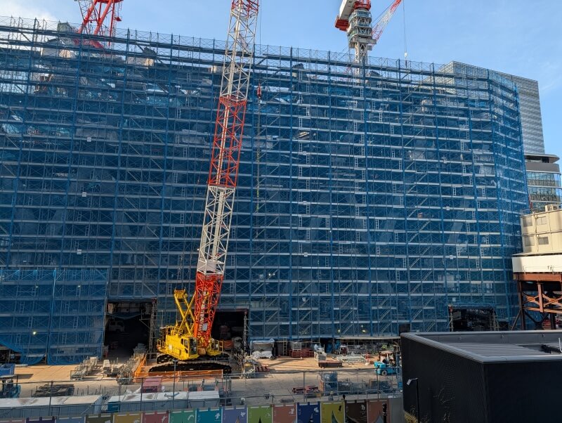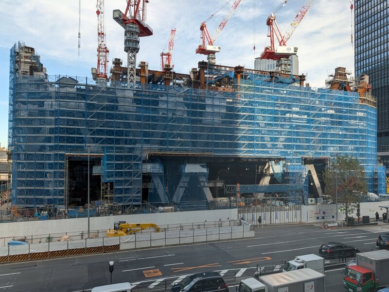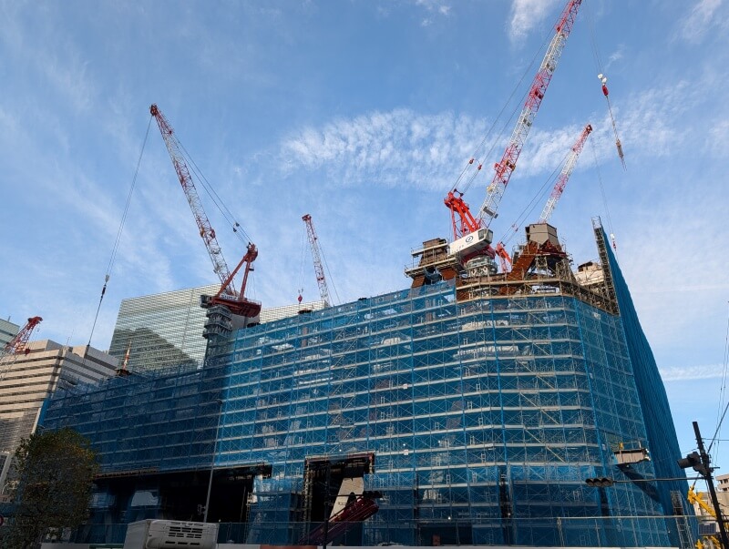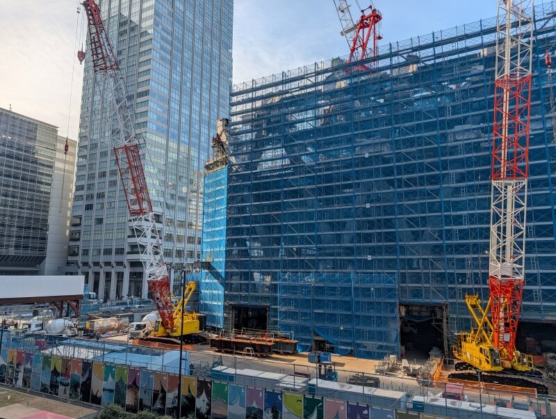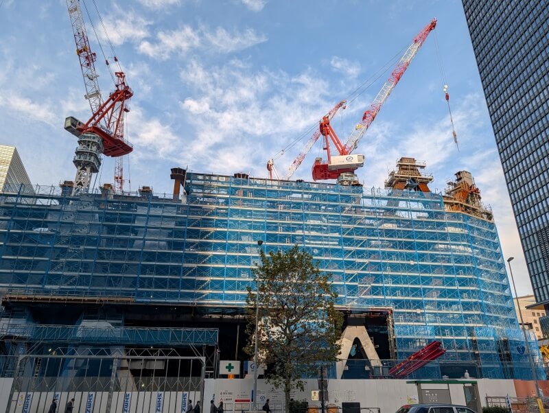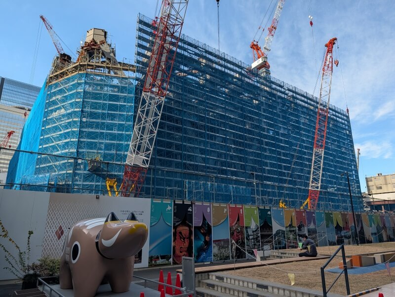 「常盤橋タワー」と「トーチタワー」の間の、巨大赤べこちゃんと一緒に、施工中の建物を見た様子です。