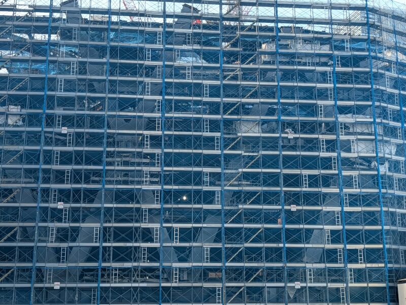 永代通り沿いから、建物南東側の鉄骨を見た様子です。