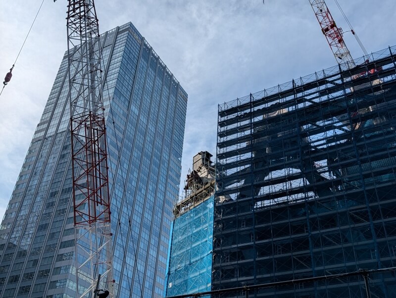 「常盤橋タワー」の傍から、「トーチタワー」の鉄骨と、「サピアタワー」を見た様子です。