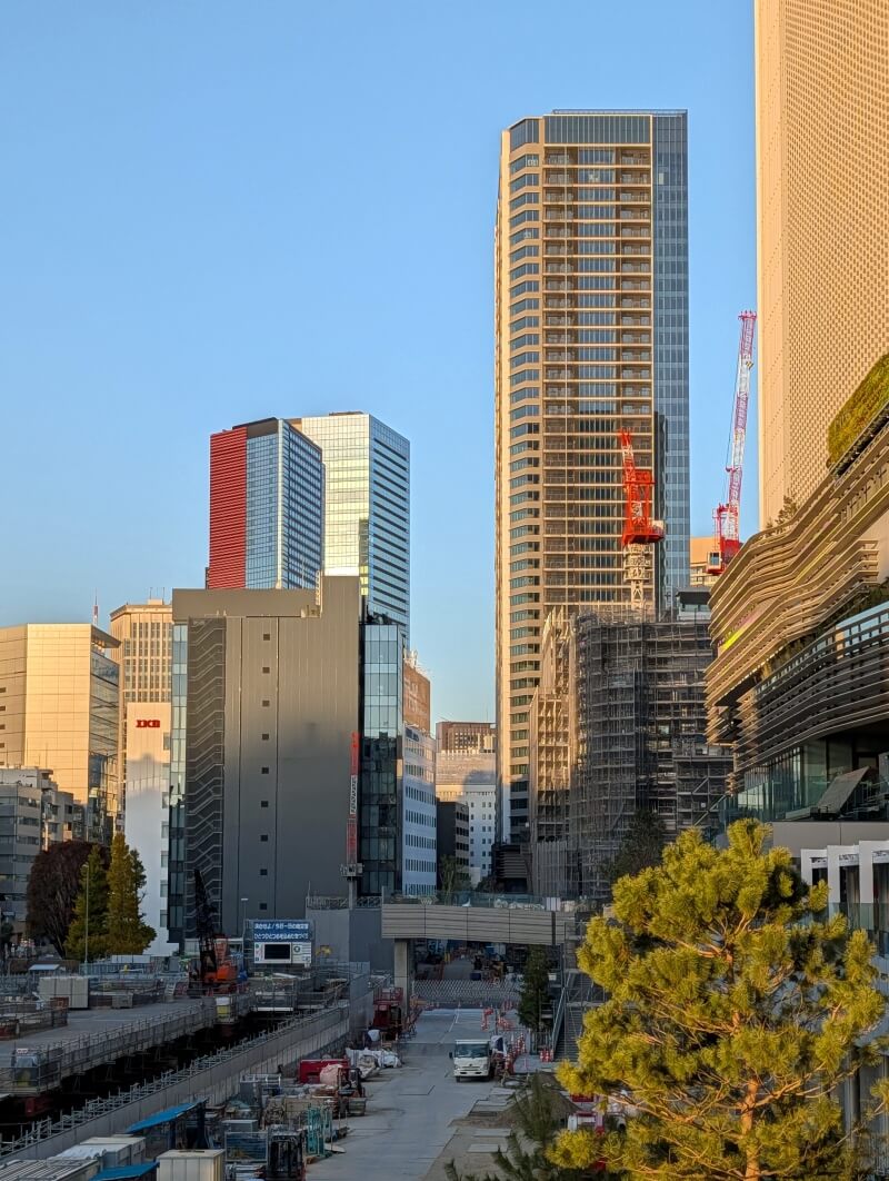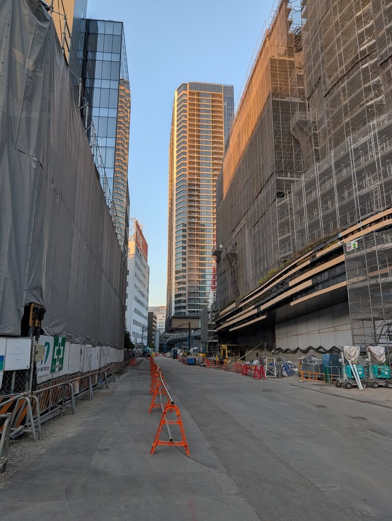 「THE LINKPILLAR 1(ザ リンクピラー ワン)」の北側から、44階172m「高輪ゲートウェイシティレジデンス」側(北側の方向)を見た様子です。