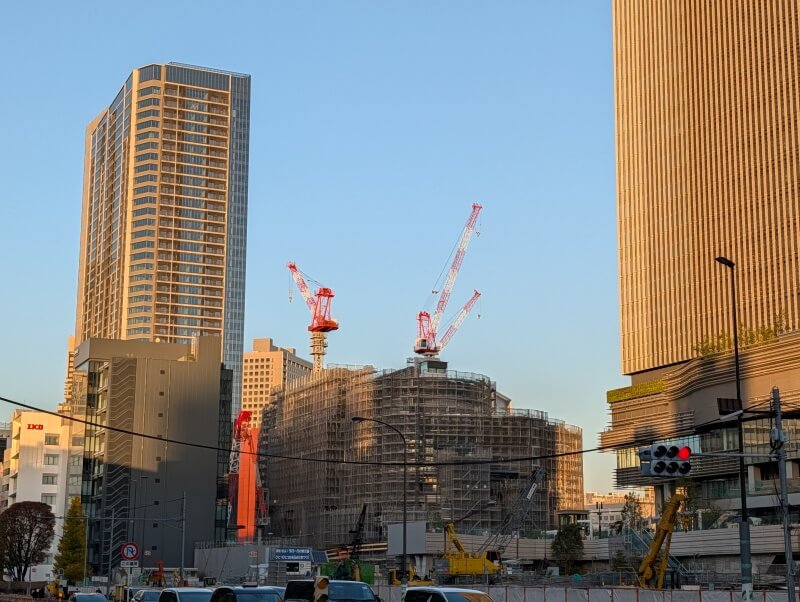 高輪ゲートウェイシティの文化創造棟の6階45m「MoN Takanawa: The Museum of Narratives」(モン タカナワ: ザ ミュージアム オブ ナラティブズ)と、44階172m「高輪ゲートウェイシティレジデンス」を撮影した様子です。