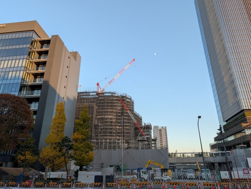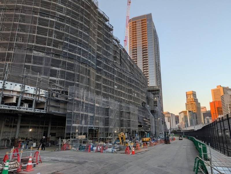 「MoN Takanawa: The Museum of Narratives」(モン タカナワ: ザ ミュージアム オブ ナラティブズ)の西側から、「高輪ゲートウェイシティレジデンス」側を見た様子です。