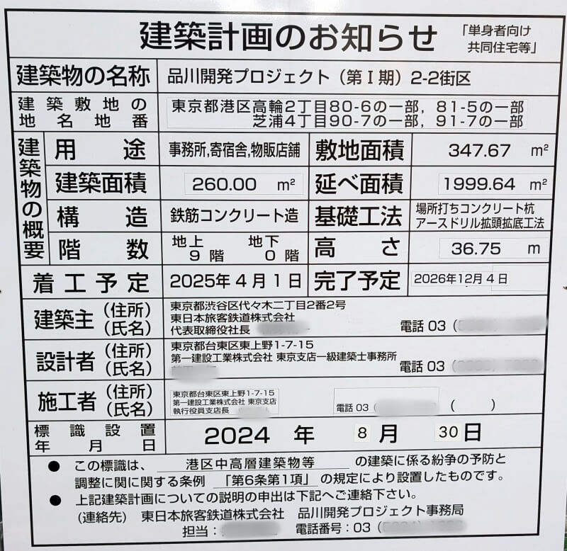 現地に掲示されていた、「品川開発プロジェクト(第Ⅰ期)2-2街区」の建築計画のお知らせです。
