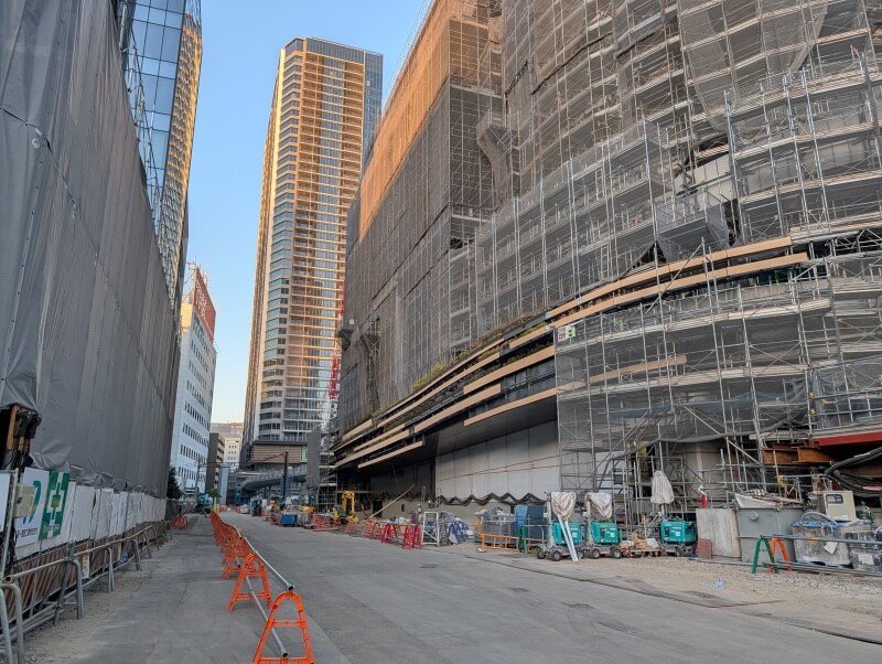 「MoN Takanawa: The Museum of Narratives」(モン タカナワ: ザ ミュージアム オブ ナラティブズ)の東側とJRの線路の間から、「高輪ゲートウェイシティレジデンス」側を見た様子です。