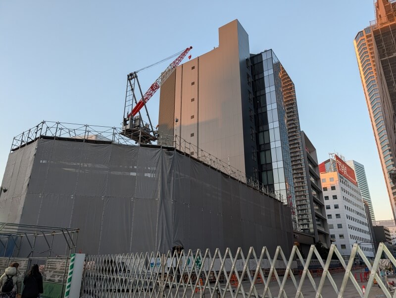 泉岳寺交差点から、「MoN Takanawa: The Museum of Narratives」(モン タカナワ: ザ ミュージアム オブ ナラティブズ)をズームして撮影した様子です。