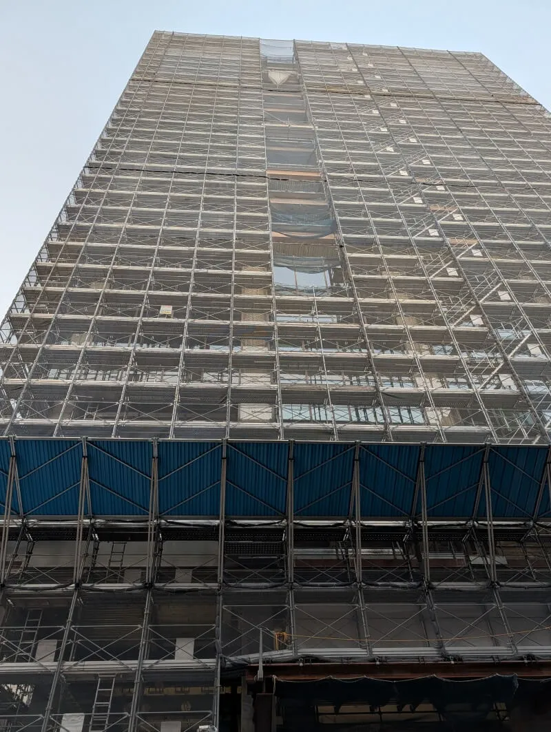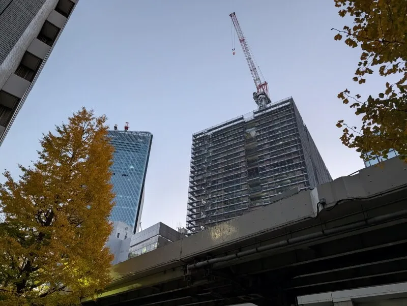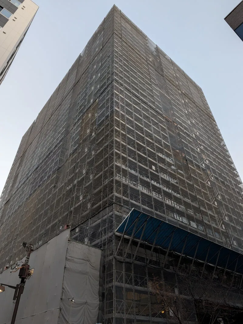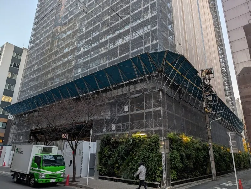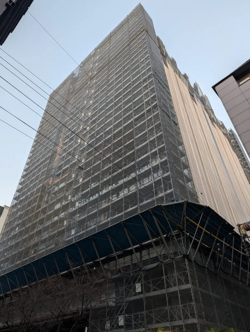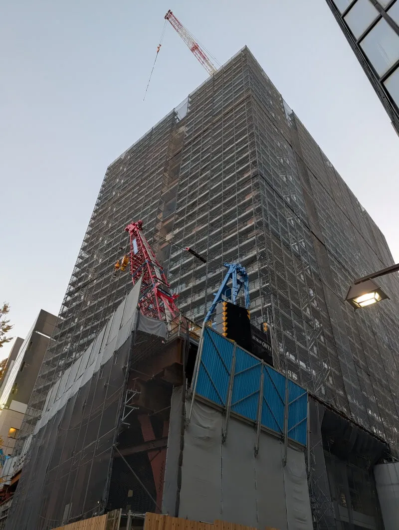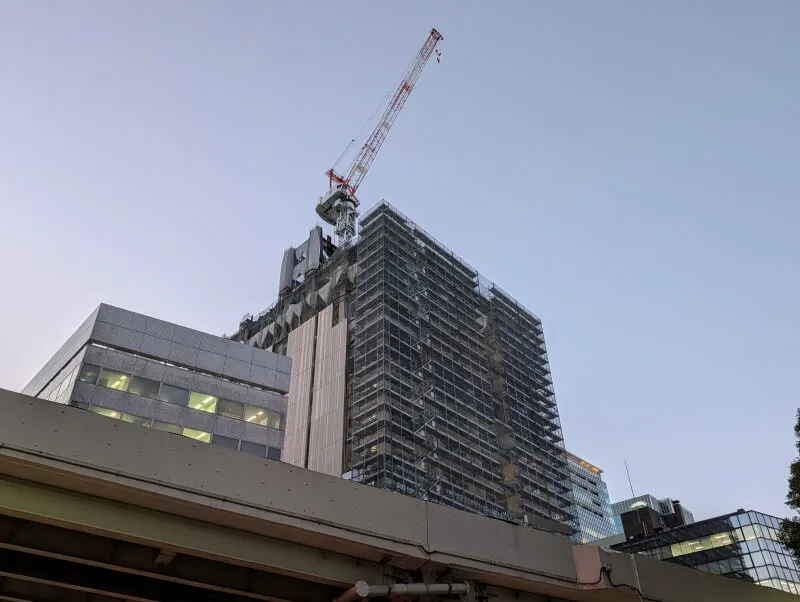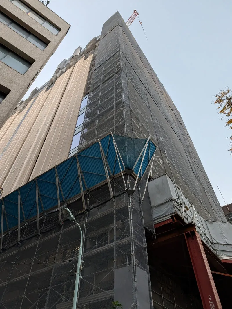 昭和通り沿いの道路の反対側から、施行中の建物を見上げた様子です。首都高が昭和通り沿いにあるので、低層階は良く見えないですが、高層階は見えるようになってきていました。