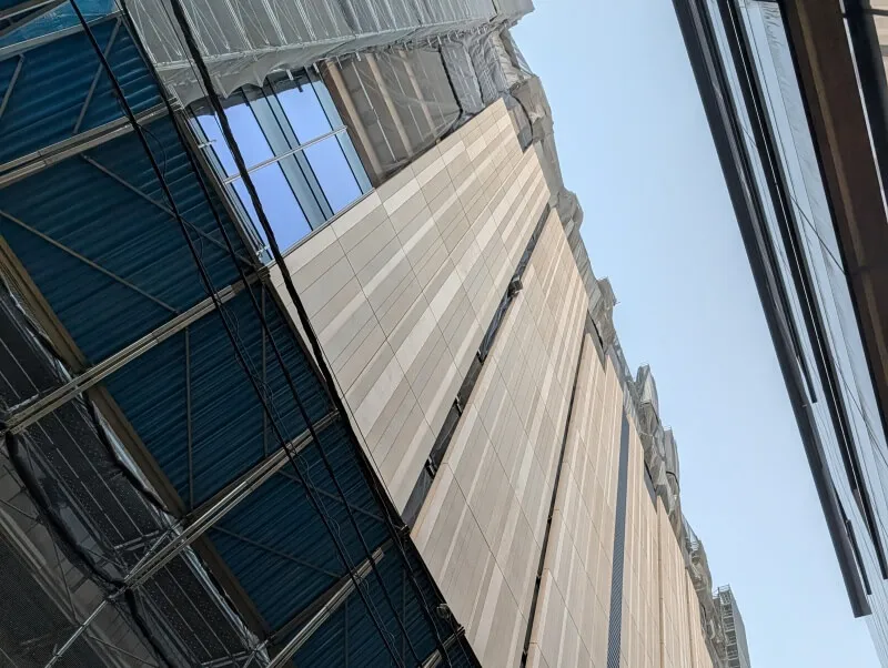 建物南側の高層階を見上げた様子です。南側は外観が一部見えていました。