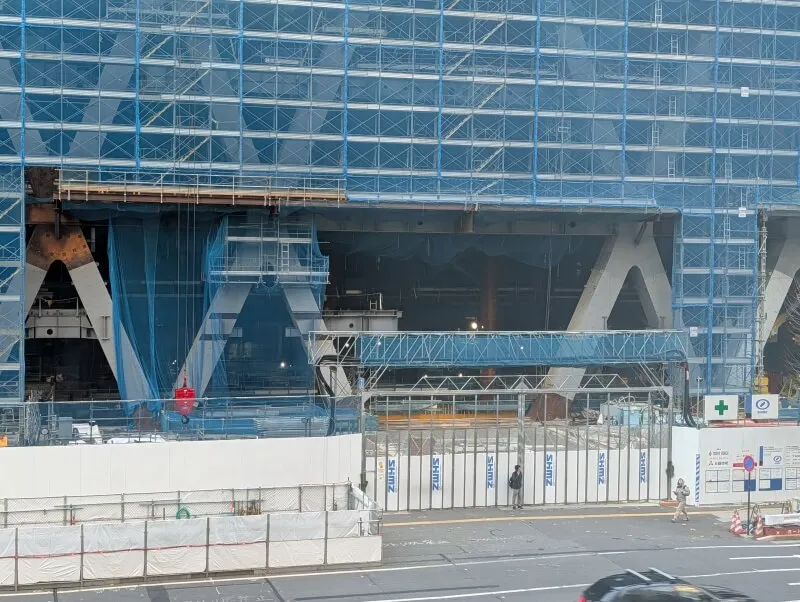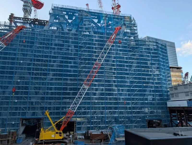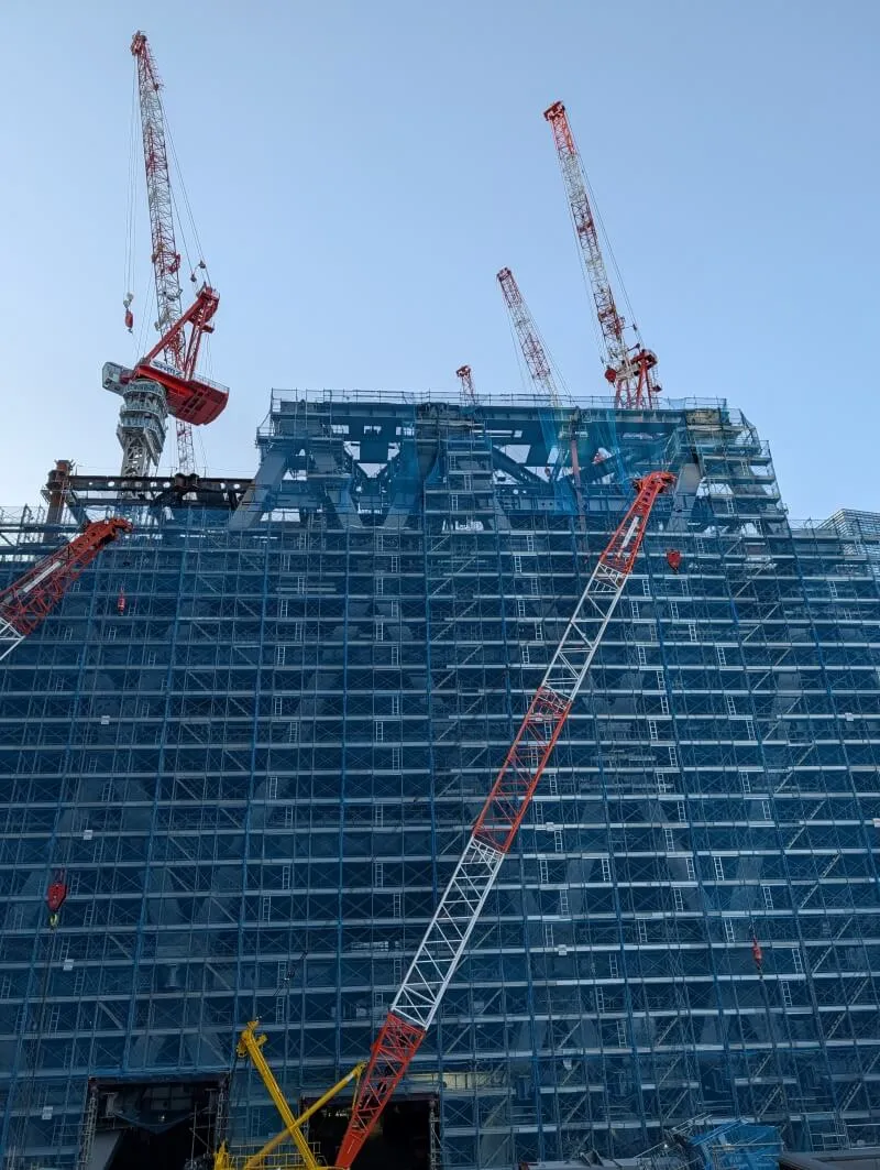 建物の北東側を見た様子です。「ダイヤグリッド架構」の低層階は9階までなので、それ以降の中層階の施工も進んで行きそうな様子でした。