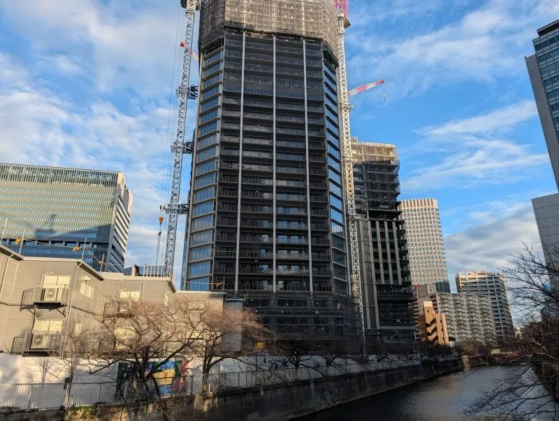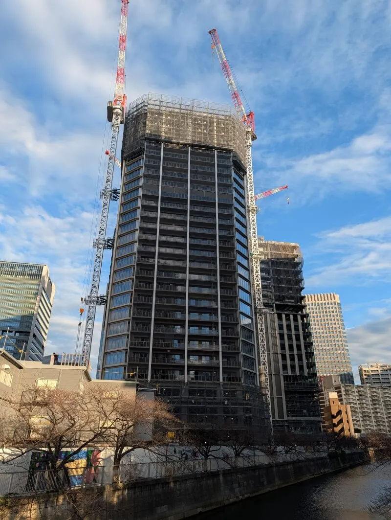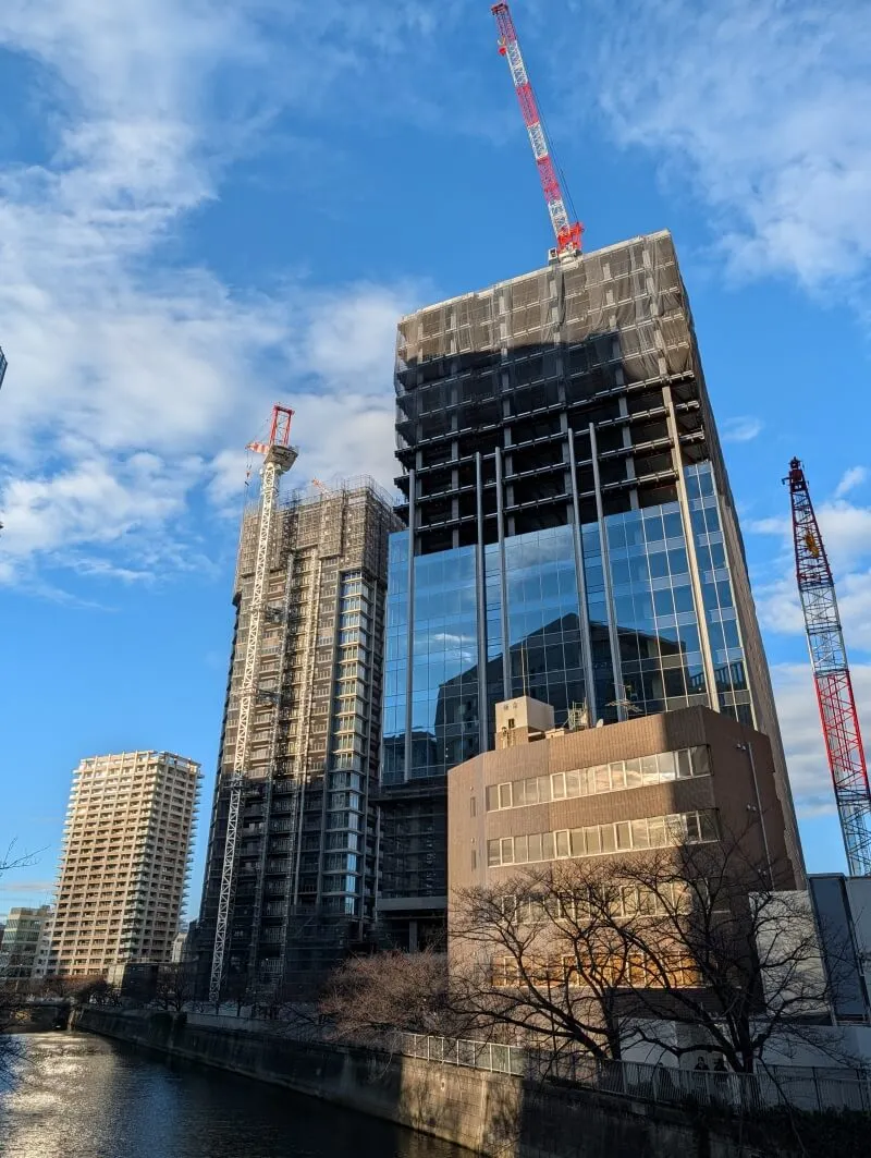 目黒川沿いの「イマジカ東京映像センター」跡地等を含むエリアで進められている再開発の、40階149m,20階100m「大崎リバーウォークガーデン」(東五反田二丁目第3地区第一種市街地再開発事業)の様子です。