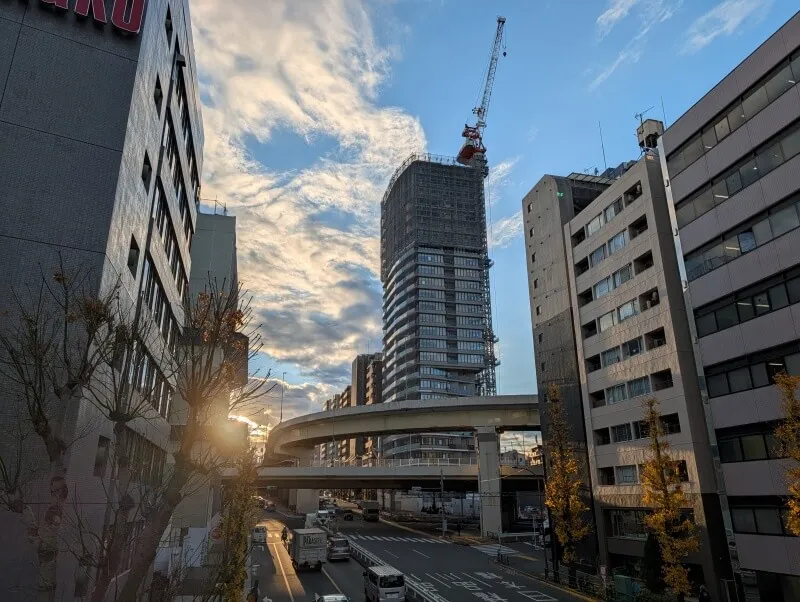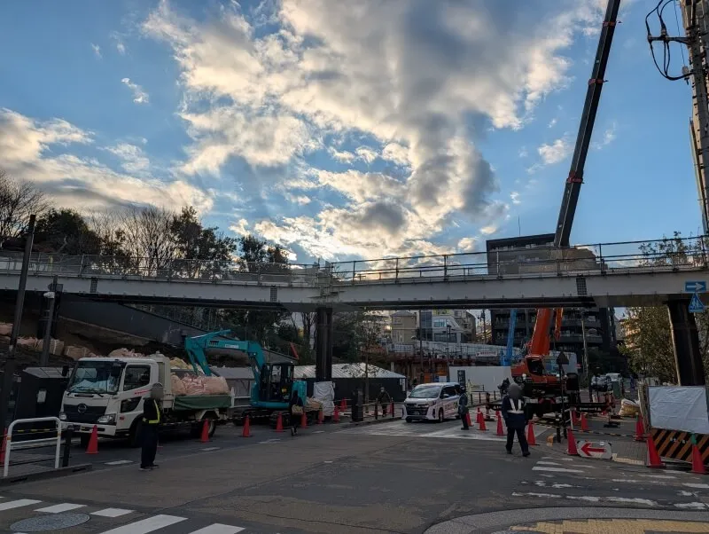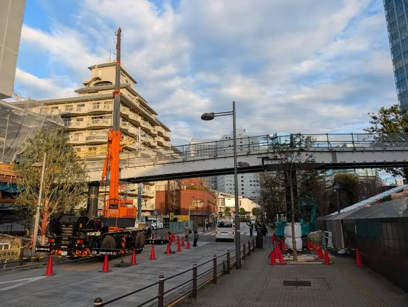 東側の大崎駅方向から、再開発の敷地を見た様子です。歩行者デッキが出現して、かなり景色が変わった感じがしました。