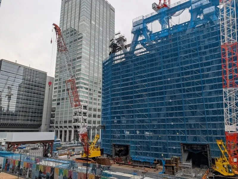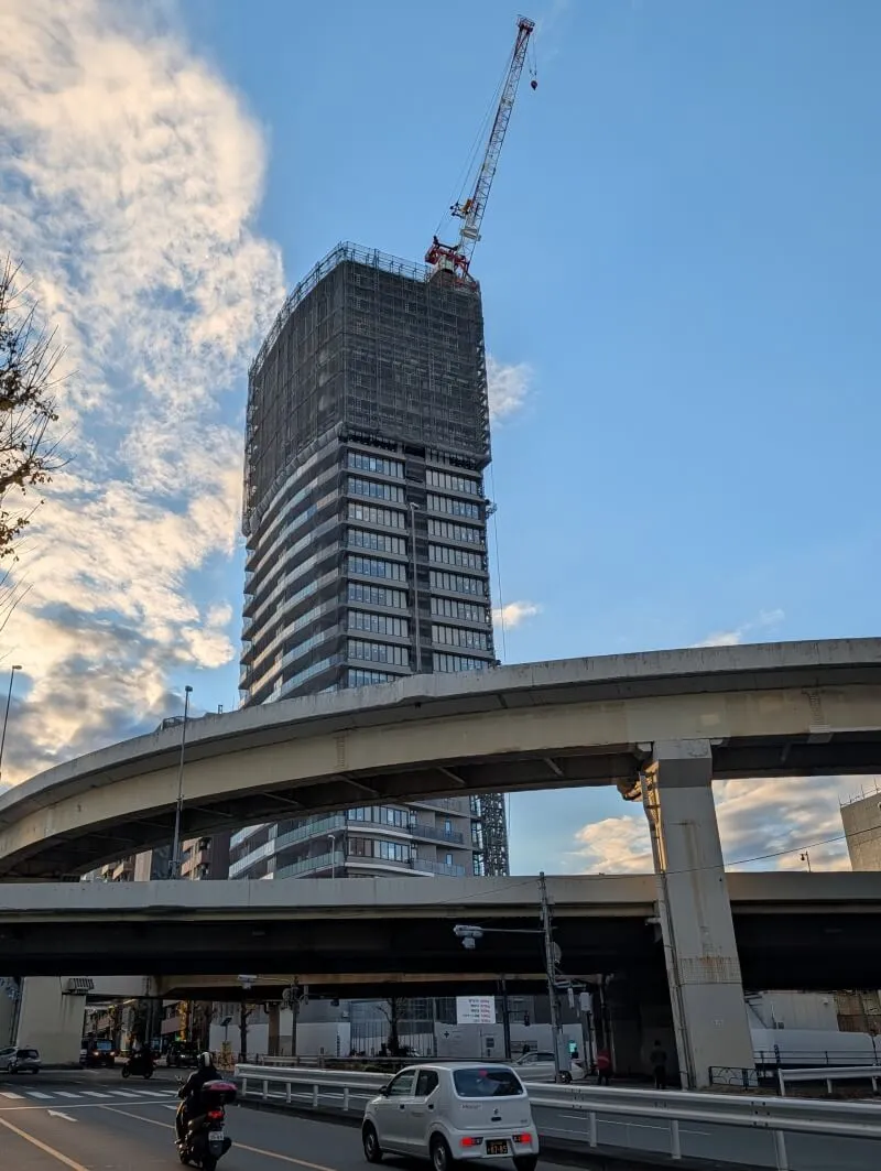 中原口交差点に架かる、中原口歩道橋の上から、施行中の建物を見た様子です。