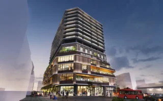 北側の東京丸子横浜線沿いから、建物の高層階を見上げた様子です。