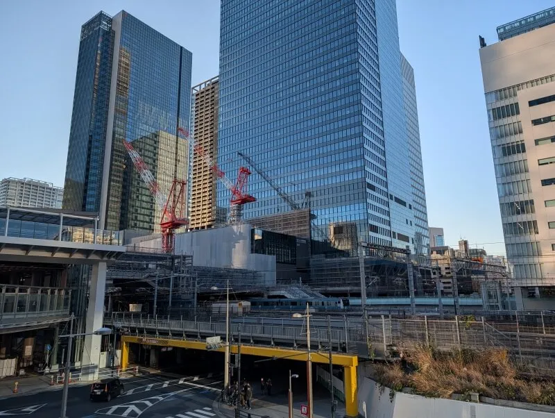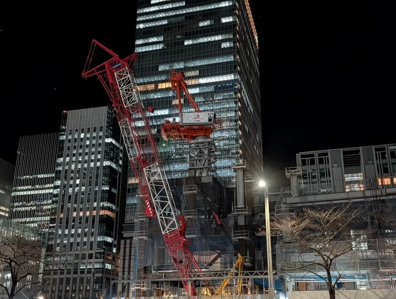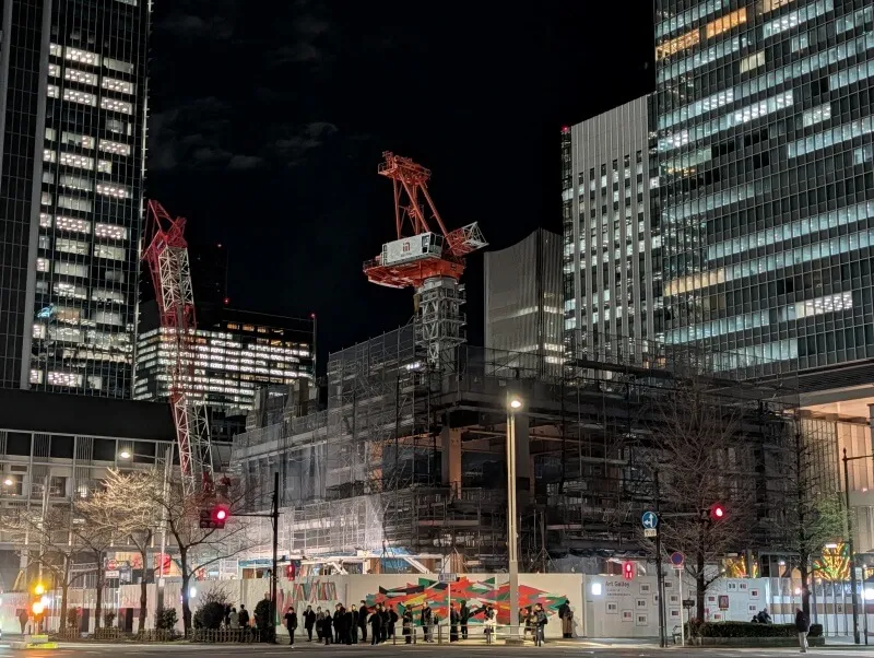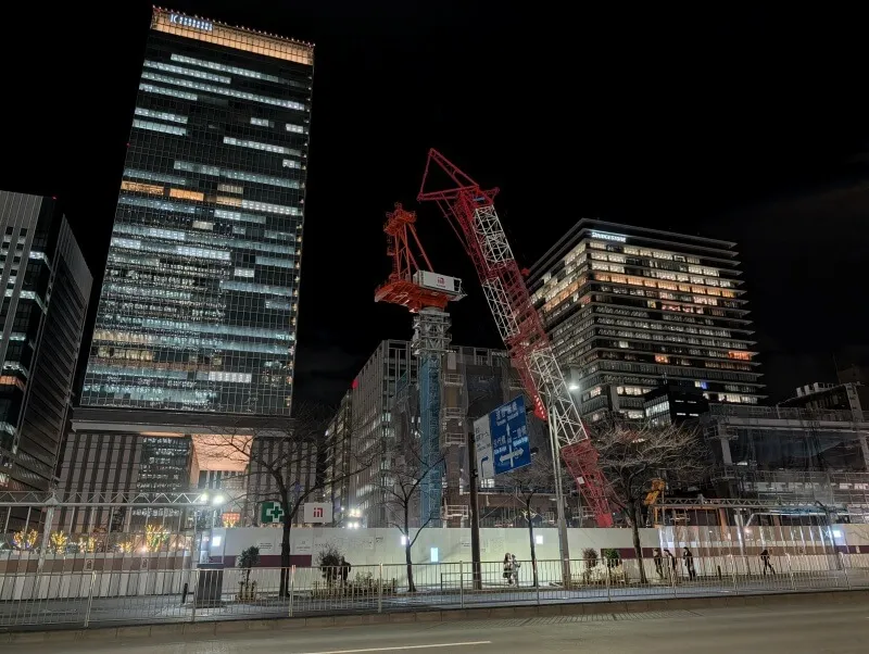 東京駅八重洲口のグランルーフから、再開発の敷地を見た様子です。数日前に寒波がやってきて、寒い中での撮影でした。南側で地上部を施工中の場所で、タワークレーンが組立中でした。