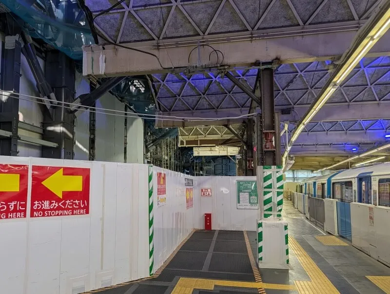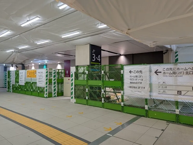 工事用の柵越しに、1・2番線に繋がるエスカレーターを見た様子です。