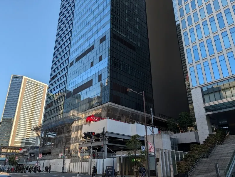同じく、歩行者デッキの上から、建物高層階を見上げた様子です。