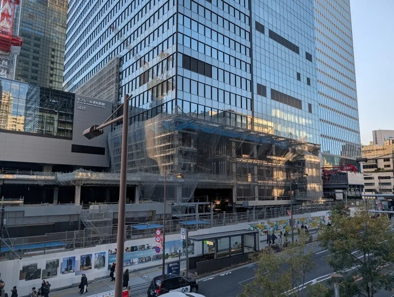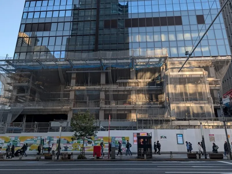 「文化放送メディアプラス」前の歩行者デッキから、モノレール棟側を見た様子です。歩行者デッキと繋がる2階部分に繋がる階段の施工が見えていました。おそらくエスカレーターも設置されるのだと思います。