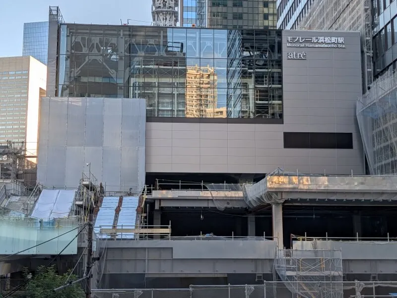 まずは、東京モノレール浜松町駅の下りホームから、工事中のモノレール棟側を見た様子です。世界貿易センタービルのモノレール棟の様子は外から見えてきましたが、駅舎中をどう切り替えるのか気になっています。