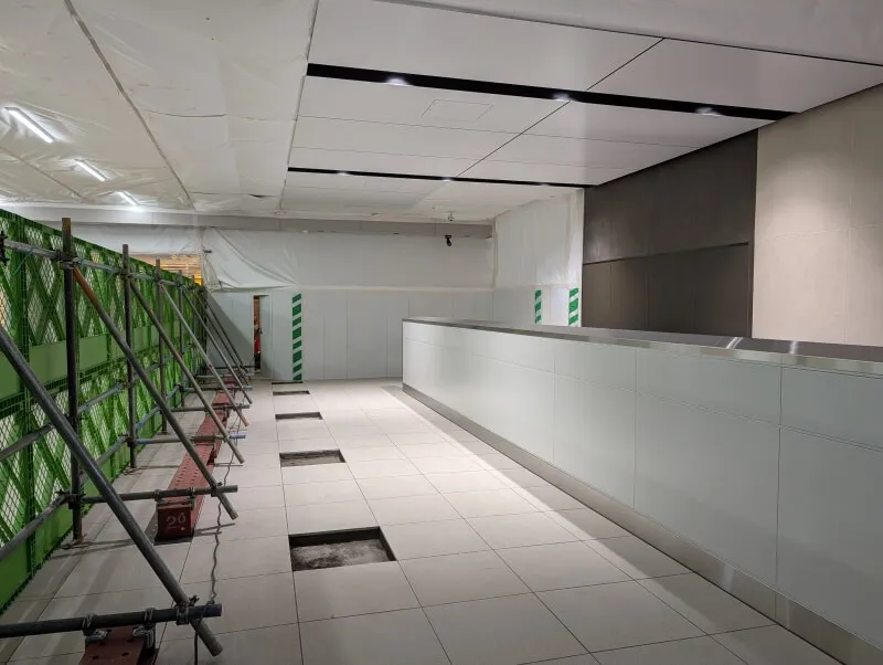 JR浜松町駅のホーム上の東西自由通路を見た様子です。自由通路の屋根などの施工が進んでいました。
