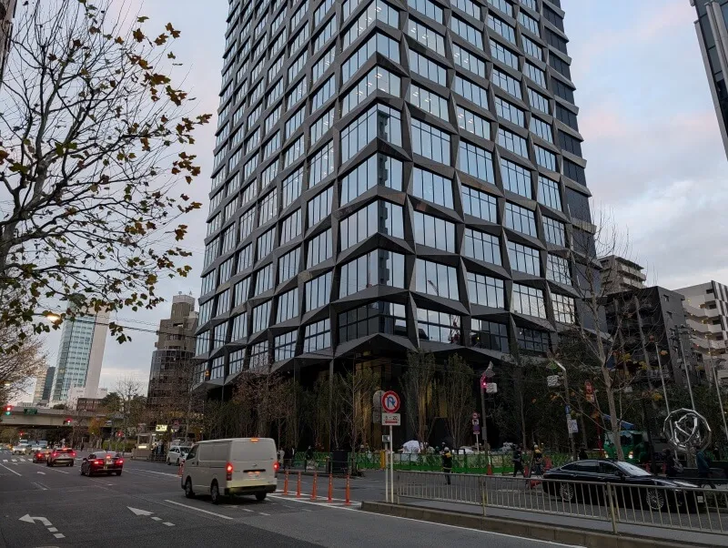 建物の北側低層階を見た様子です。低層階はまだ緑色の工事用の柵が設置されており、植栽工事が行われていました。