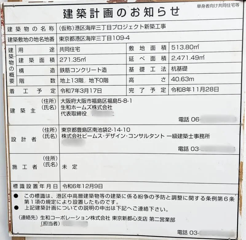 13階40mの「(仮称)港区海岸三丁目プロジェクト新築工事」で、建築主は生和ホームズ。設計は、株式会社ビームス・デザイン・コンサルタントです。単身者向け共同住宅になる予定です。