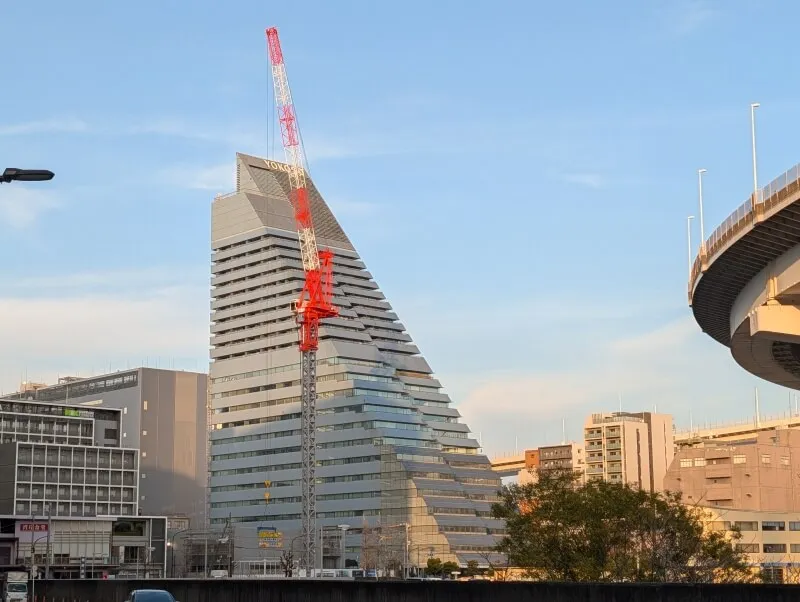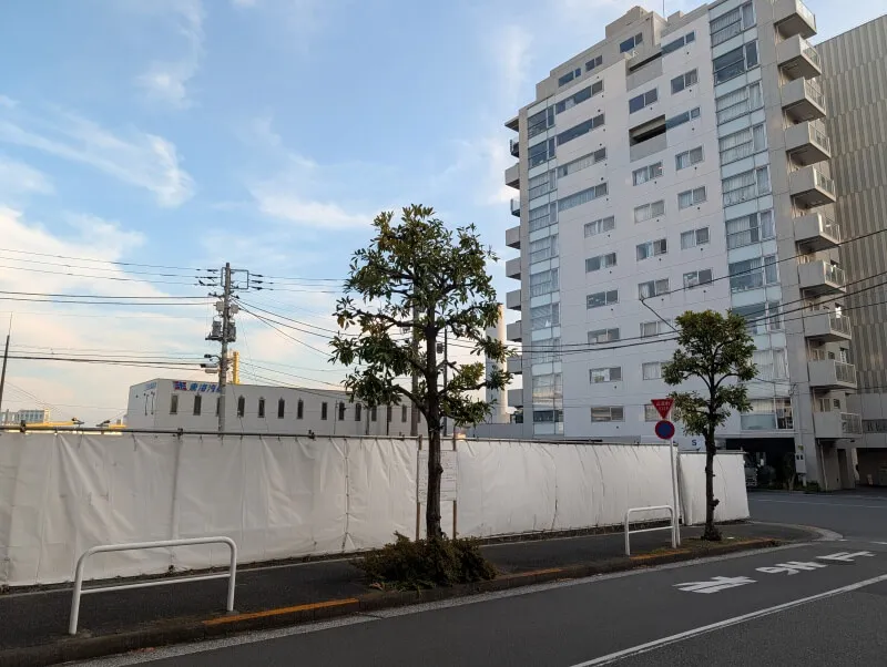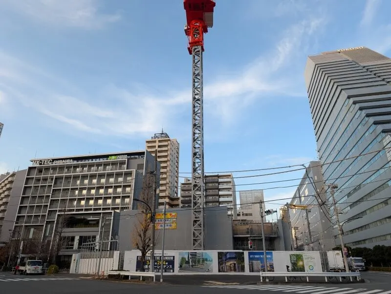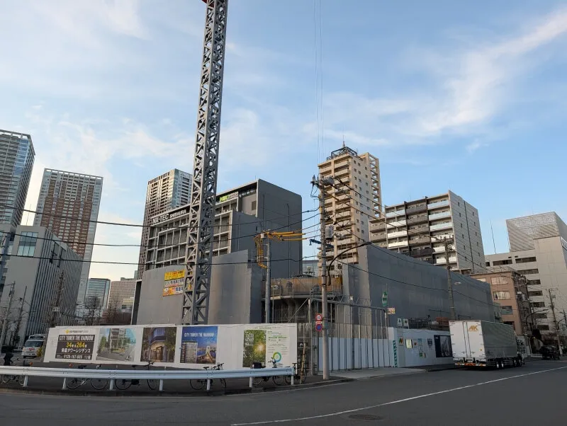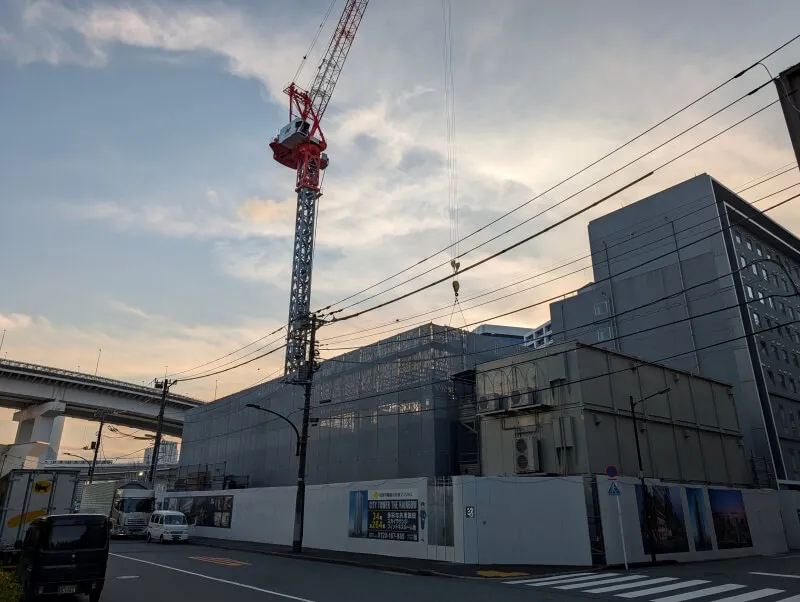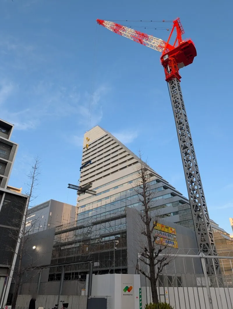 北側に移動し、「ヨコソーレインボータワー」の建物傍から、施行中の建物低層階を見た様子です。