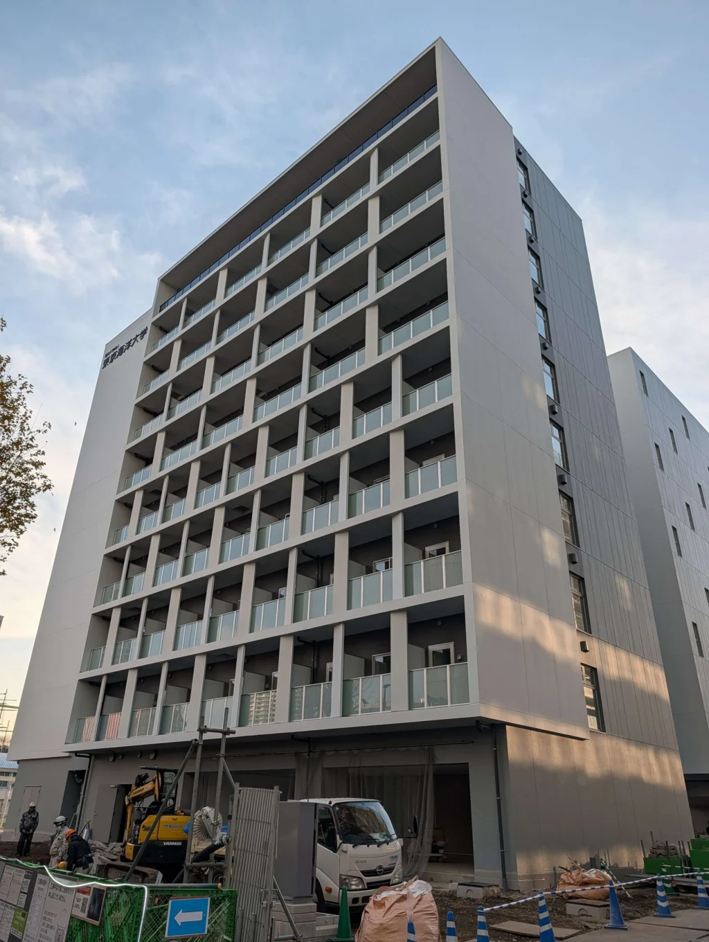 東京海洋大学の品川キャンパス グラウンドで施工中の、10階33m「東京海洋大学(品川)国際混住寮(仮称)新営工事」の様子です。
