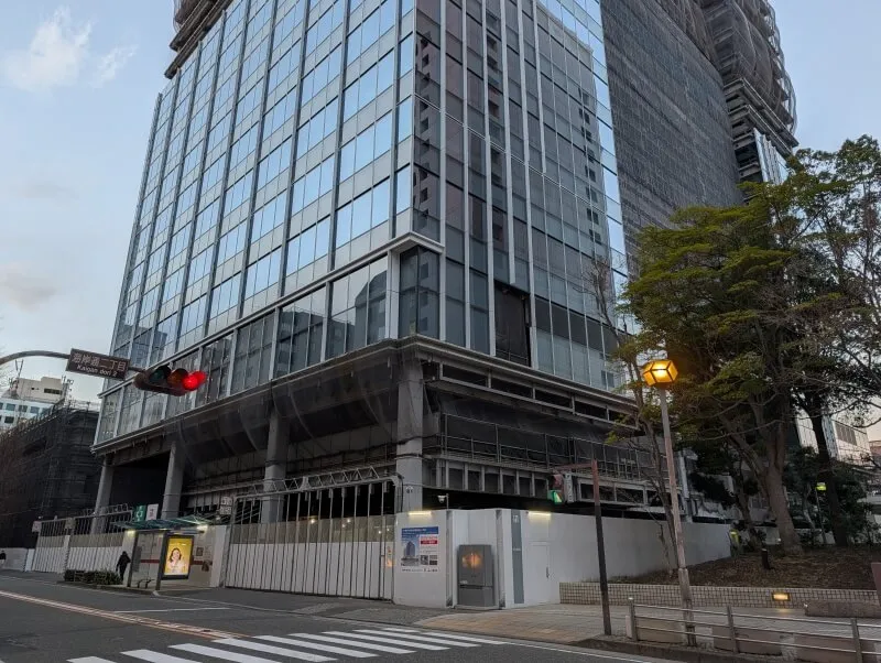 現地に掲示されていた、建物の案内です。2027年1月に竣工予定で、テナントを募集中でした。