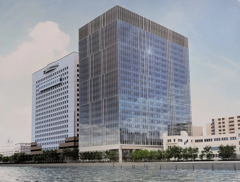 運河の渡った所にある「よこはま新港合同庁舎」傍から、建物を見た様子です。