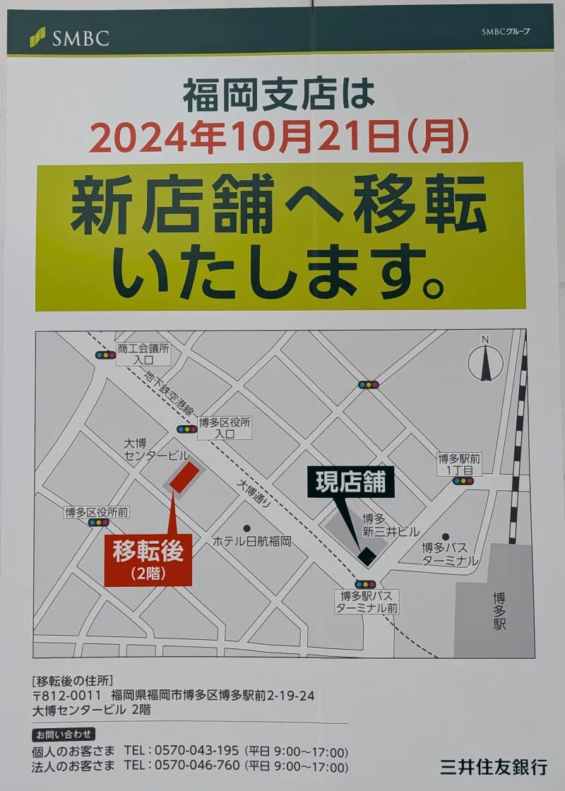 建物に入っていた、三井住友銀行福岡支店は、大博センタービルの2階に移転したそうです。