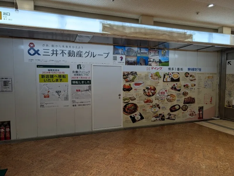 博多駅と繋がる地下通路を見た様子です。建物地下と繋がっていたと思われる、地下通路は工事用のパネルで閉鎖されていました。