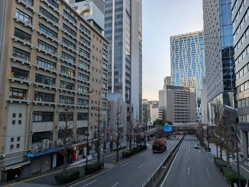金王坂上の歩道橋から、A街区とB街区が建つ、金王坂を見た様子です。金王坂沿いの建物は、まだ解体工事は行われていませんでした。