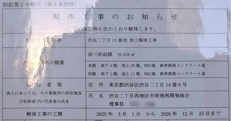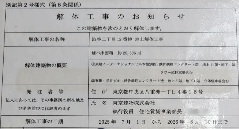 B街区側の解体工事のお知らせです。解体工事の期間は、2026年12月25日迄となっていました。