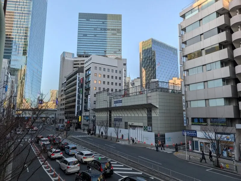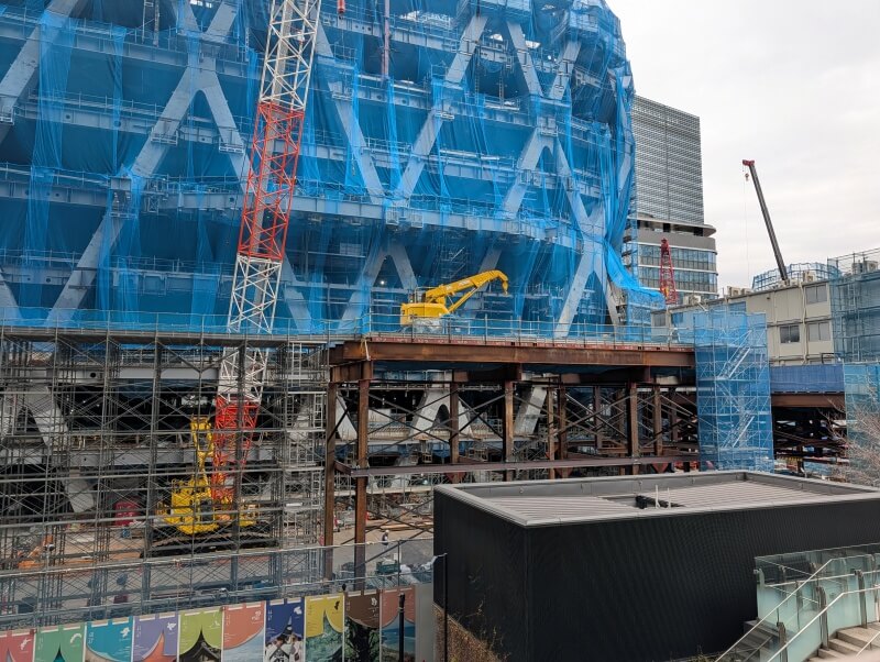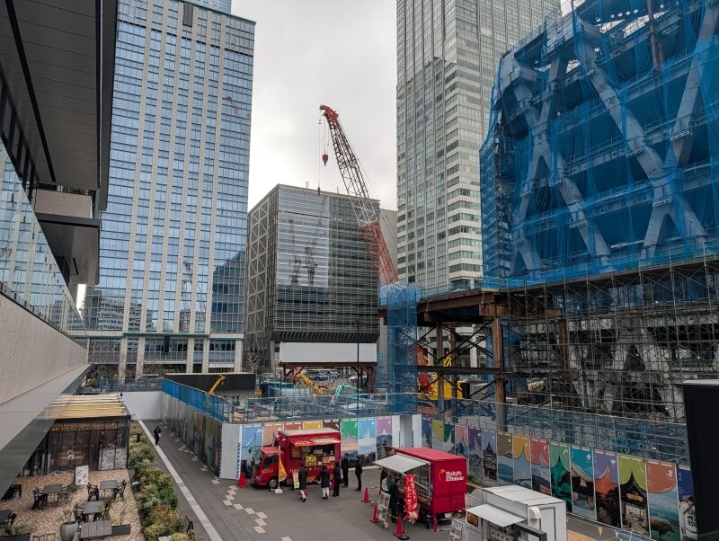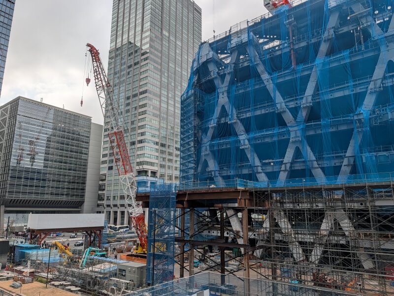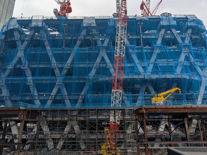 「常盤橋タワー」2階から、東京駅日本橋口側を見た様子です。建物東側の低層階で作業用として使われていた足場が撤去され、巨大な建物の重さを支える「ダイヤグリッド架構」の鉄骨部分が見えてきていました。