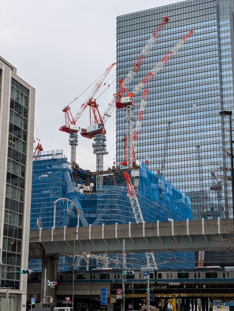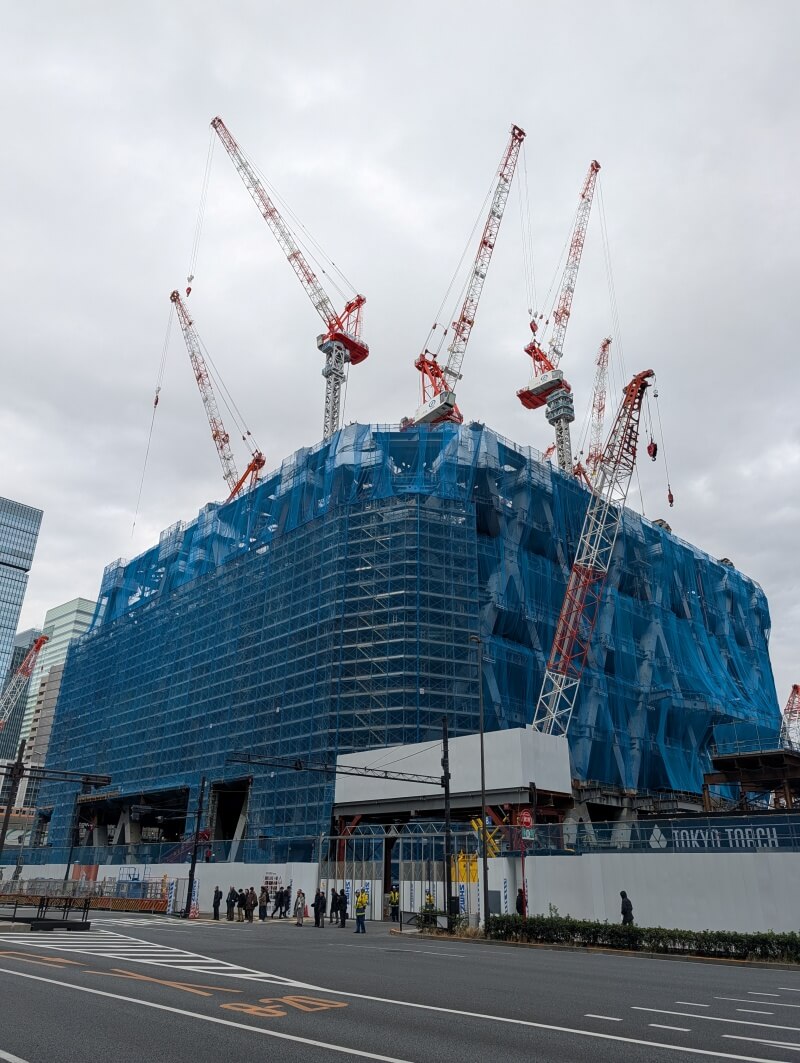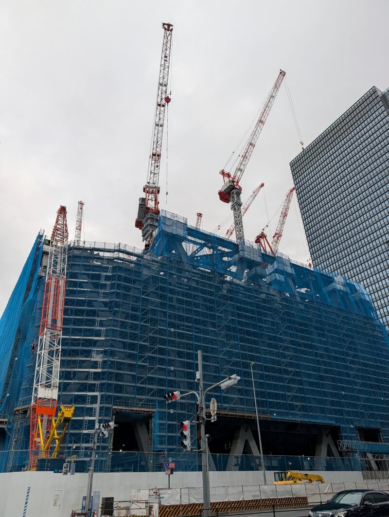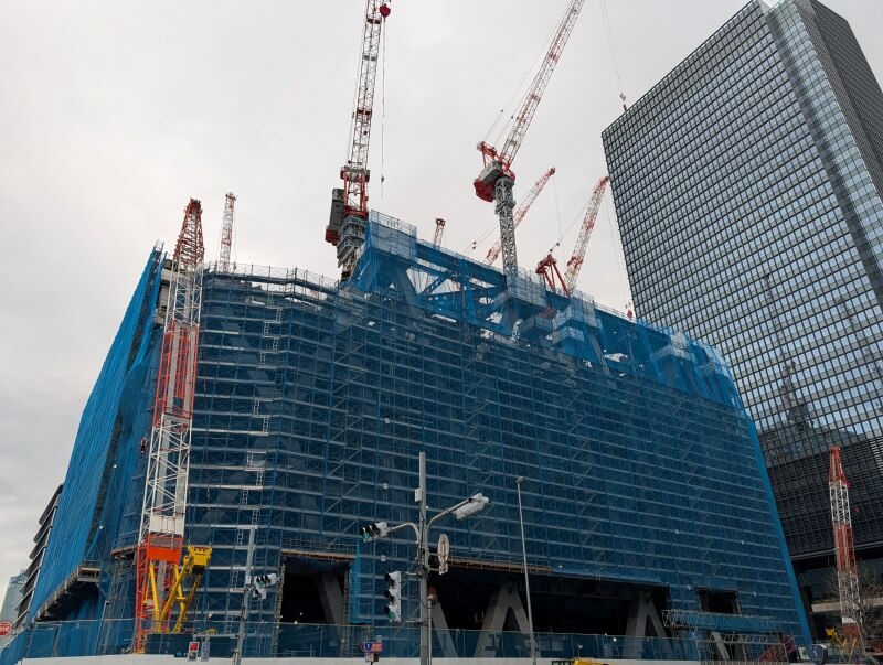 東京駅日本橋口側を見た様子です。タワークレーンの高さが伸びていました。東京駅の日本橋口を出ると、いきなり巨大な建造物が見えてくる事となります。