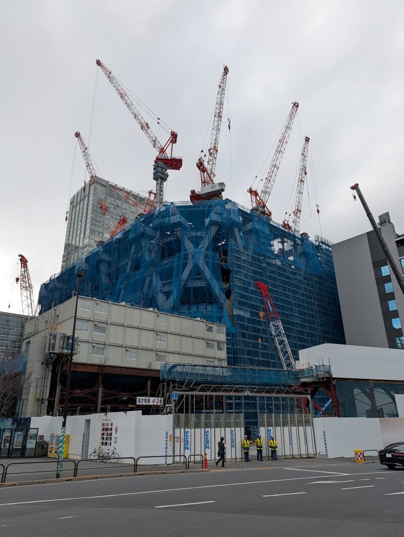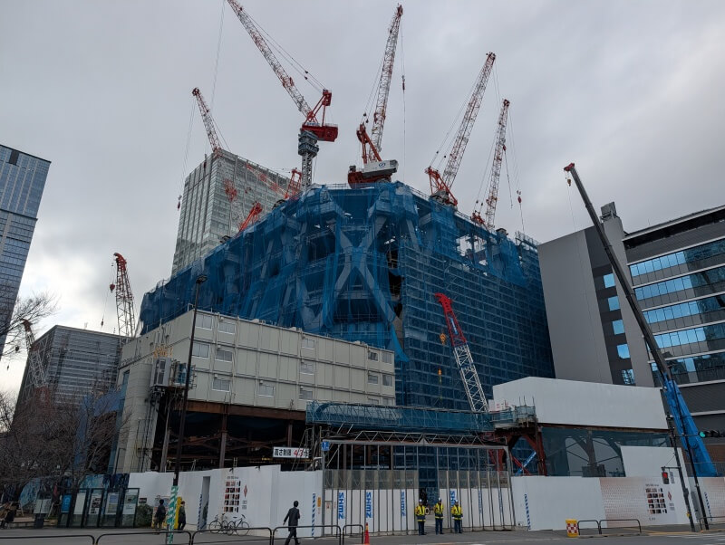 永代通り沿いの東側の、「常盤橋タワー」と「丸の内トラストタワー」の前から、施工中の「Torch Tower(トーチタワー)」を見た様子です。
