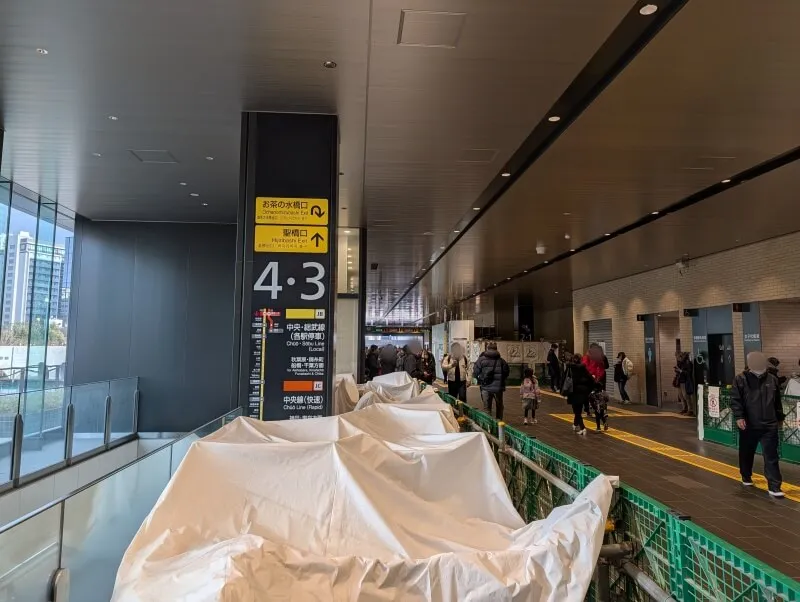 お茶の水橋口側の駅舎内を見た様子です。駅舎内の通路の半分が整備中で、通れなくなっていました。