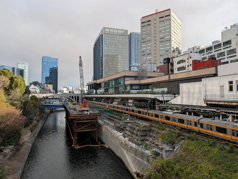 明大通りが通るお茶の水橋の上から、JR御茶ノ水駅を見た様子です。神田川に設置されている、工事用の仮設の足場は、まだ残っていました。