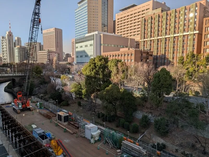 「エキュートエディション御茶ノ水」の2階から、神田川の上に設置された、工事用の仮設足場を見た様子です。