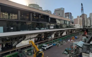 日本橋川の上に架かる錦橋を南下して、構内整備工事が行われている敷地を見た様子です。