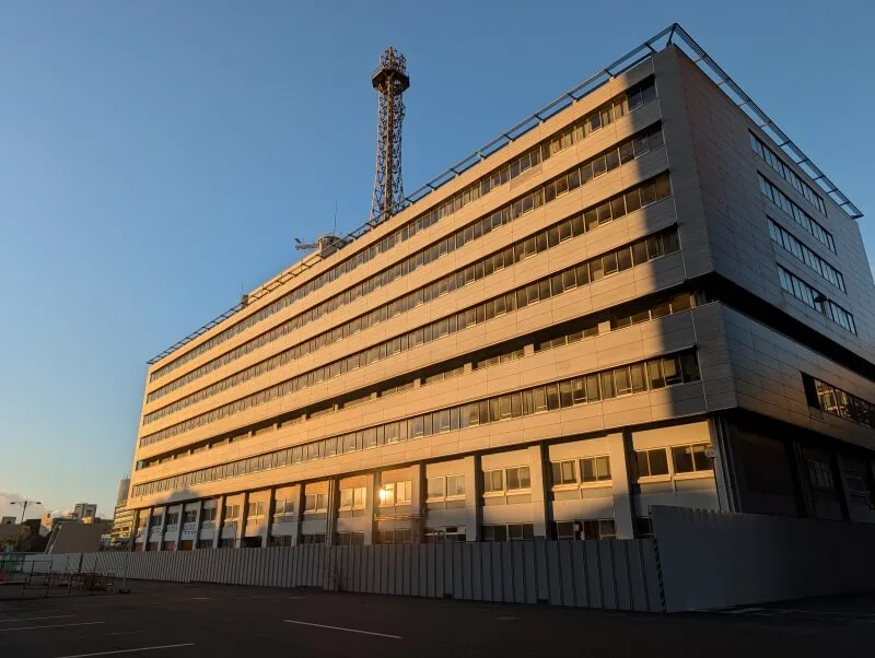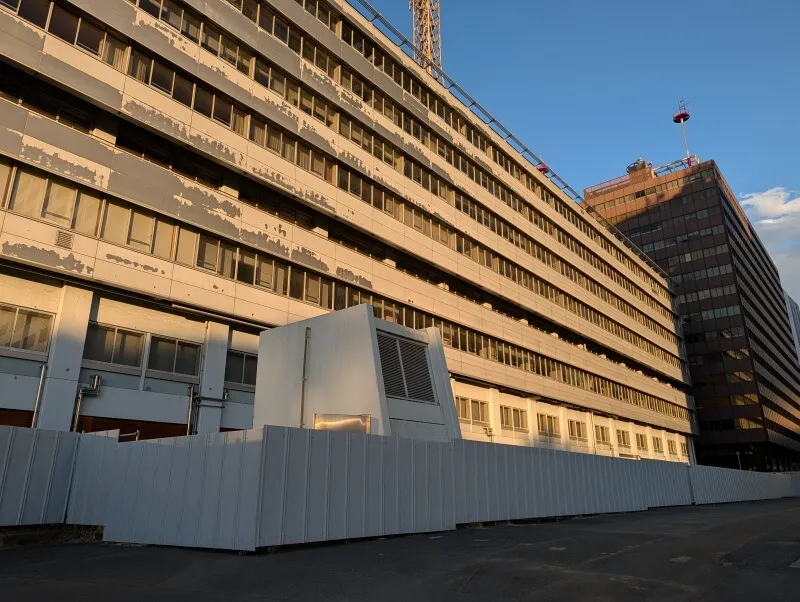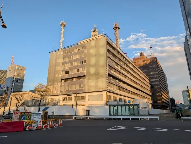 旧庁舎の南側を見た様子です。建物の周辺は、工事用の白いフラットパネルで覆われていました。