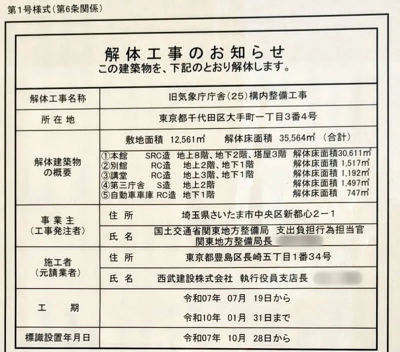 現地に掲示されていた、解体工事のお知らせです。施工者は、西武建設株式会社となっていました。
