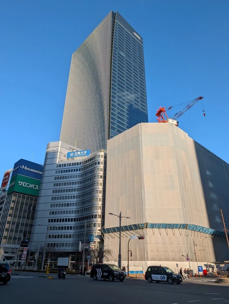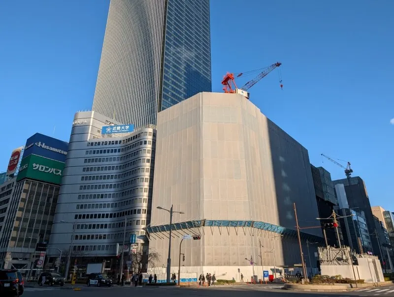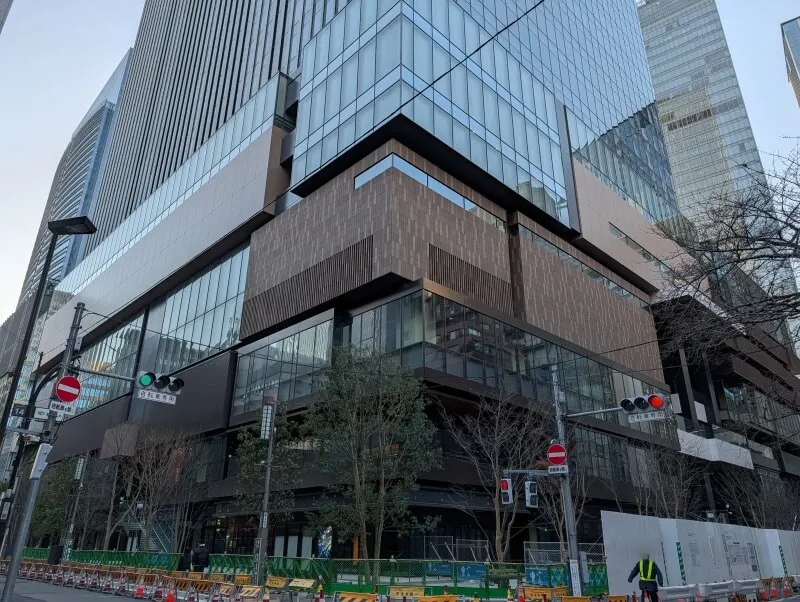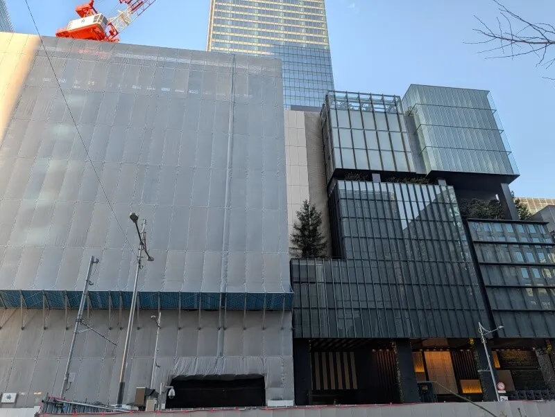 八重洲通りと外堀通りの交わる八重洲中央口交差点から、再開発の敷地を見た様子です。手前の「トフロム ヤエス ザ フロント」側は、カバーに覆われており、まだ見えませんでした。