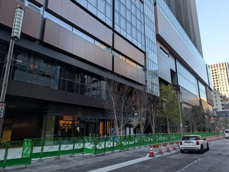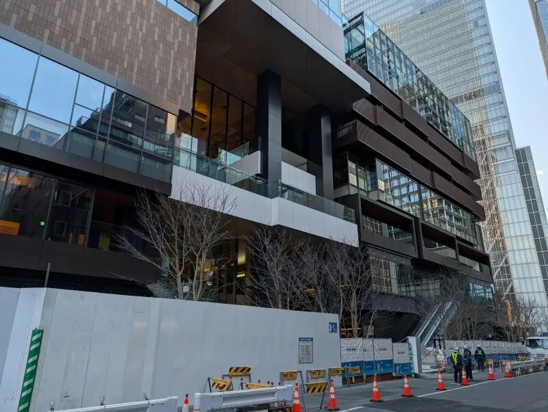 再開発の敷地東側の、八重洲仲通り沿いを見た様子です。工事用の白いパネルが撤去されており、低層階が見えていました。